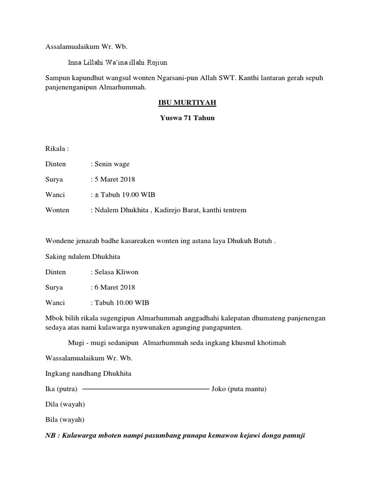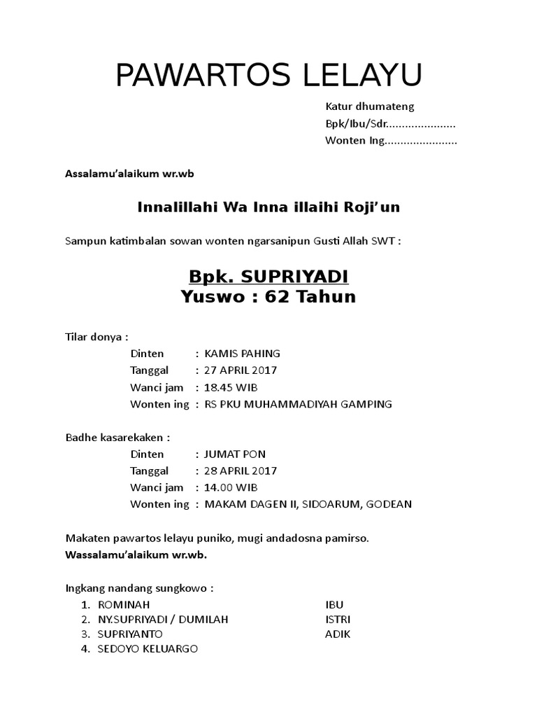 Contoh Surat Berita Lelayu Bahasa Jawa-Pawartos Lelayu