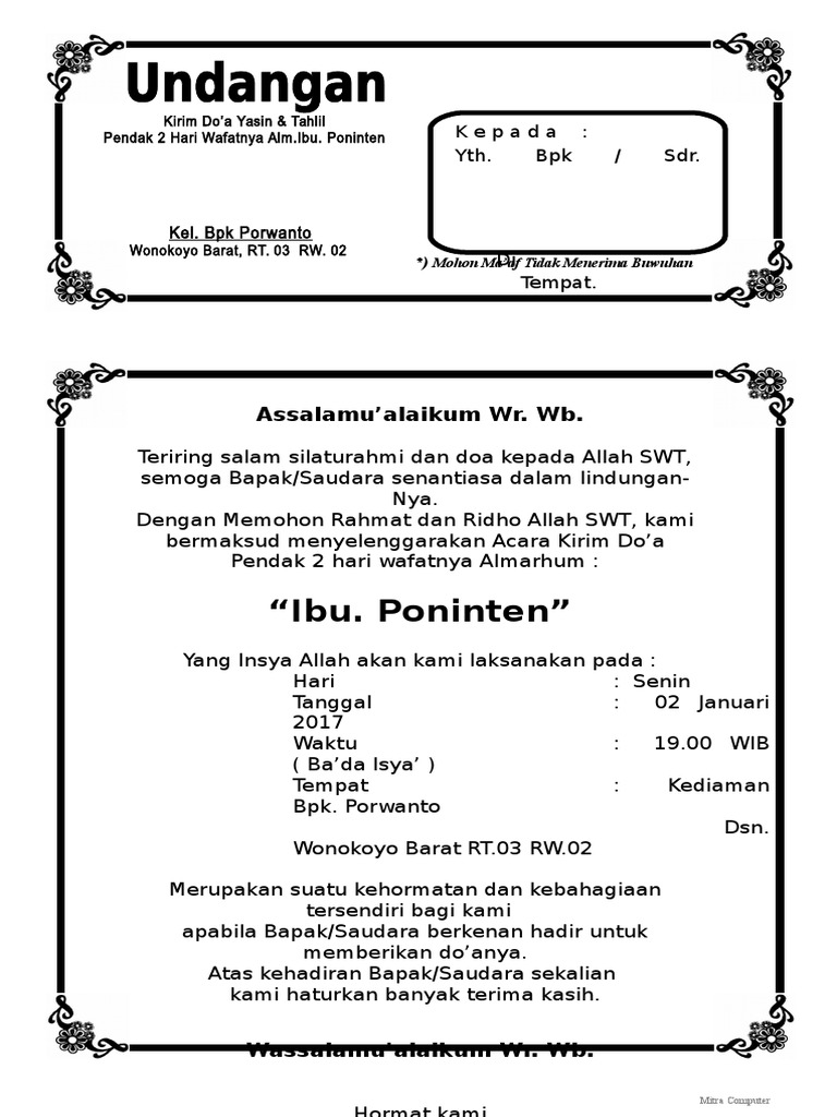 DOC) Contoh Surat Undangan Tahlil 40, 100, 1000 hari | Teja Sukmana - Academia.edu