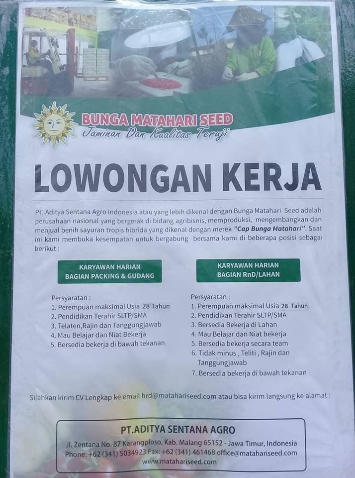 Lowongan Kerja CV. Aditya Sentana Agro Indonesia (Matahari Seed) - Malang, Jawa Timur - Lowongan Kerja Info dan Jadwal Jobfair Hari Ini