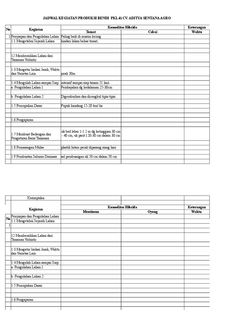 Jadwal Kegiatan Produksi Benih Pkl Di Cv. Aditya Sentana Agro No Kegiatan Komoditas Hibrida Keterangan Tomat Cabai Waktu