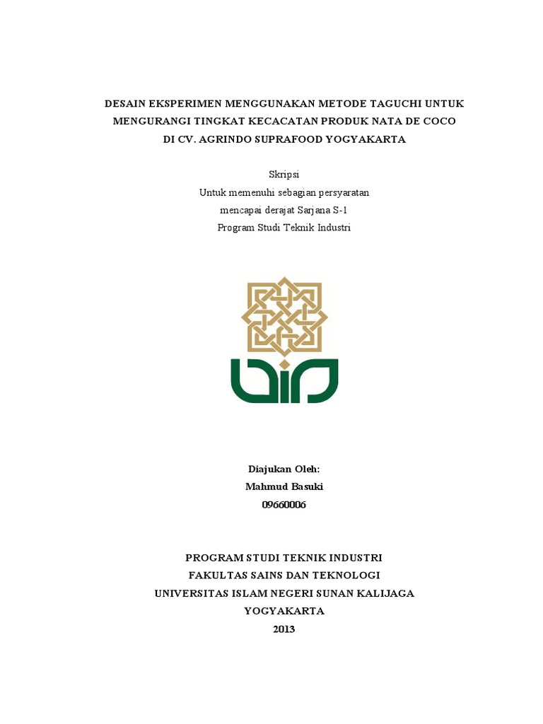 DESAIN EKSPERIMEN MENGGUNAKAN METODE TAGUCHI UNTUK MENGURANGI TINGKAT KECACATAN PRODUK NATA DE COCO DI CV. AGRINDO SUPRAFOOD YOGYAKARTA - Institutional Repository UIN Sunan Kalijaga