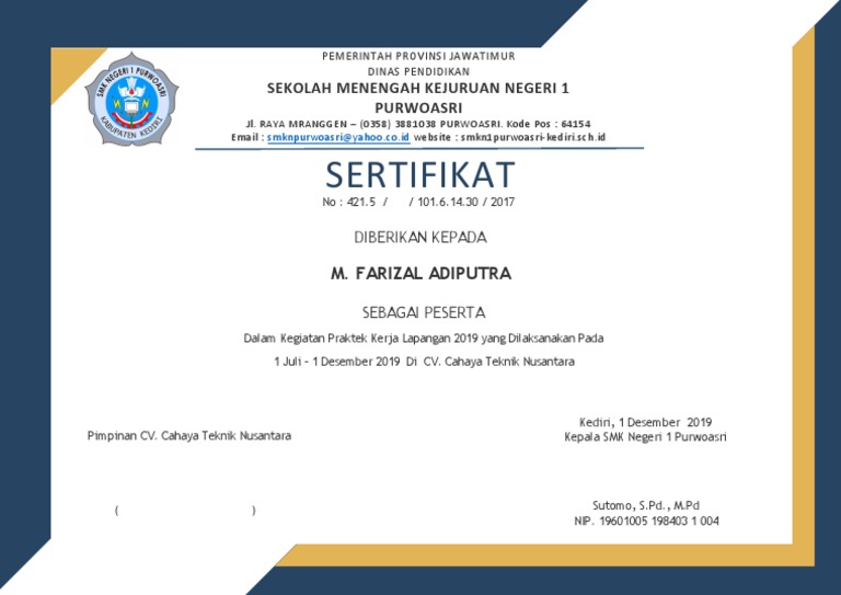 Sertifikat: Sekolah Menengah Kejuruan Negeri 1 Purwoasri