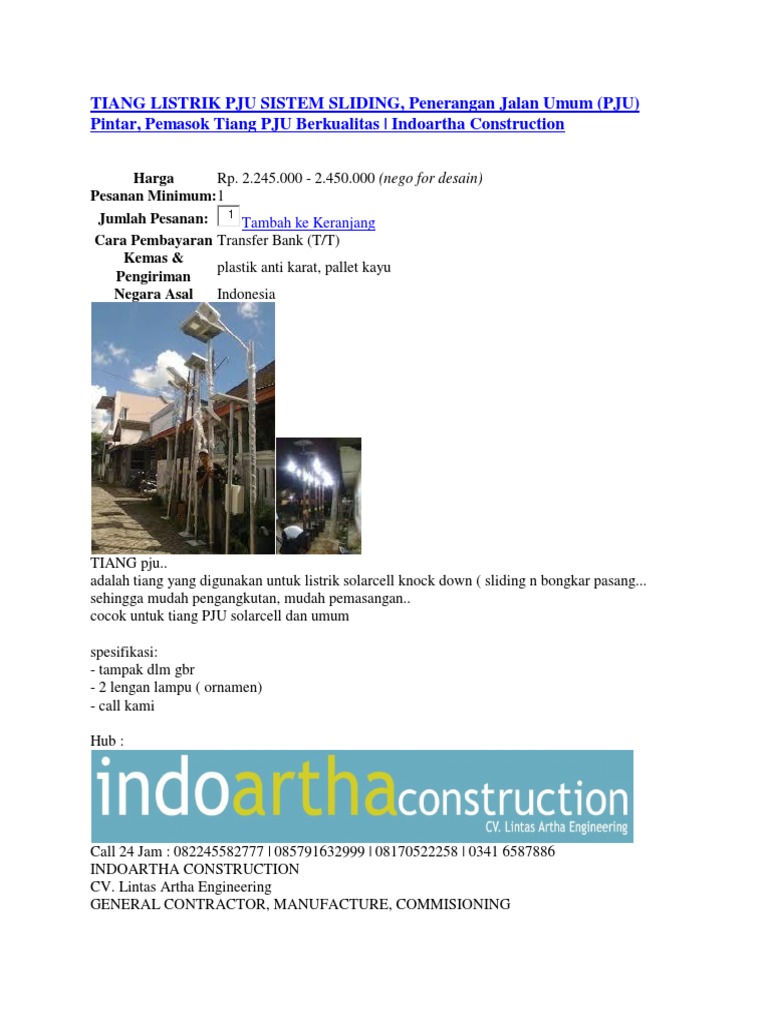 TIANG LISTRIK PJU SISTEM SLIDING, Penerangan Jalan Umum (PJU) Pintar, Pemasok Tiang PJU Berkualitas | Indoartha Construction
