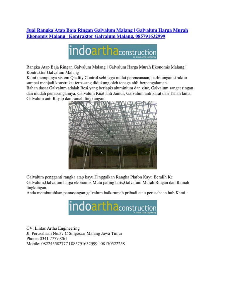 Pemasangan Rangka Atap Baja Ringan Galvalum Malang, Baja Ringan Kepanjen 085791632999 (Indosat) - [PDF Document]