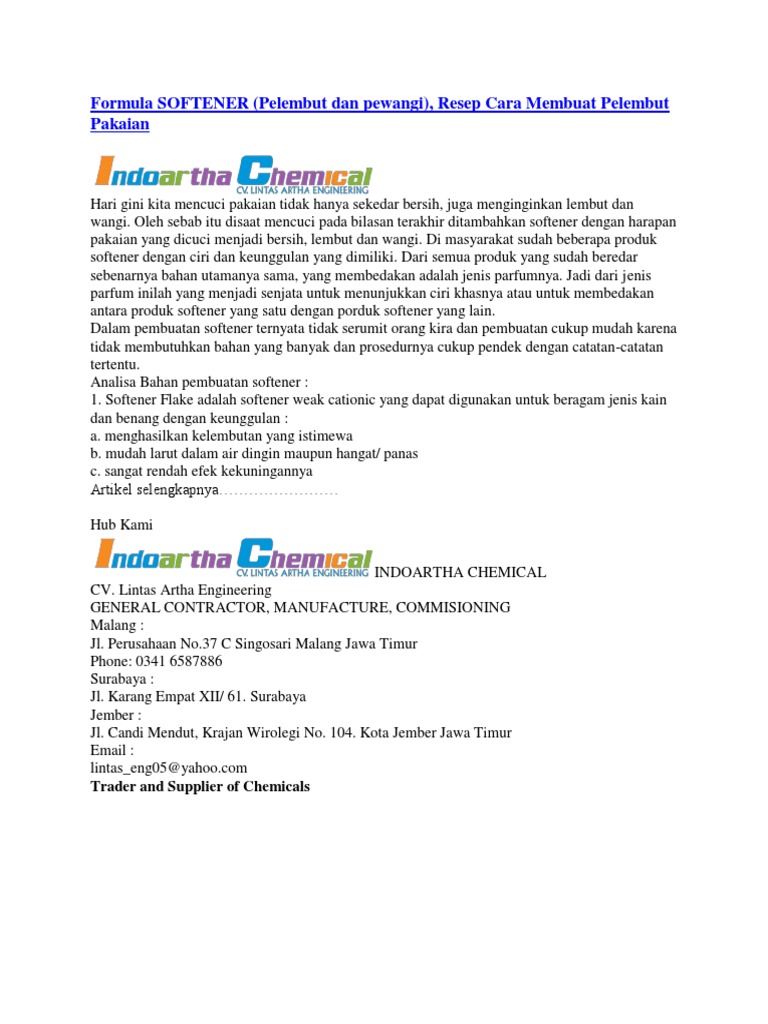 Formula SOFTENER (Pelembut dan pewangi), Resep Cara Membuat Pelembut Pakaian - [PDF Document]
