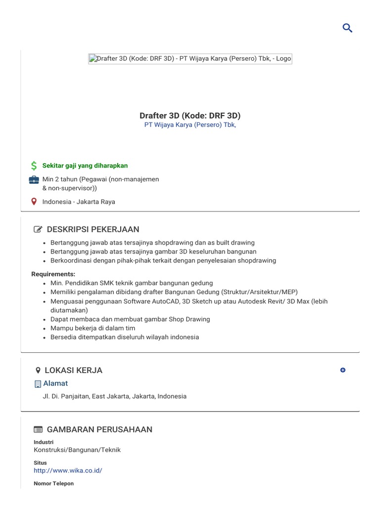 Drafter 3D (Kode_ DRF 3D) Pekerjaan - PT Wijaya Karya (Persero) Tbk, - 1976002 _ JobStreet _ JobStreet | Stocks | Investing