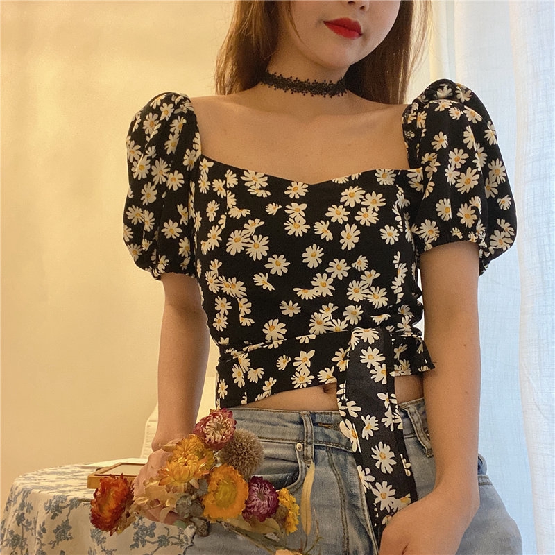 Blus Wanita Model Resleting Dan Lengan Bubble Dengan Bahan Sifon Gambar Bunga Daisy Bergaya Retro | Shopee Indonesia