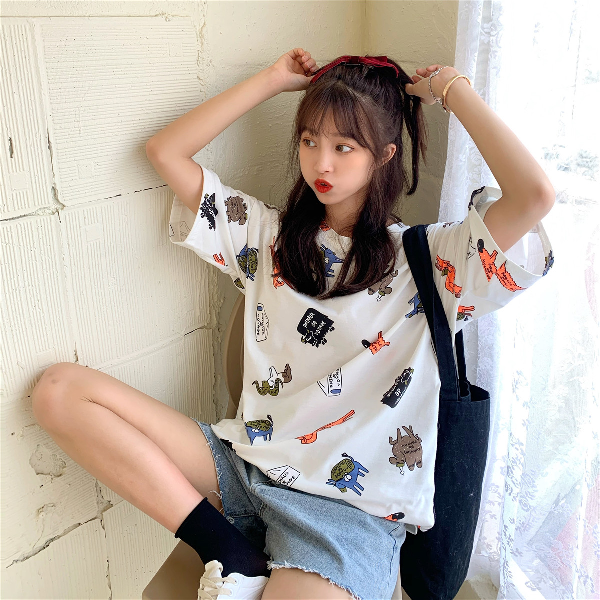 2818#Gambar SebenarLengan PendekTShirt Wanita Musim Panas Baru Baju Kemeja Versi Korea Longgar Kartun Cetakan Bunga Le | Shopee Malaysia