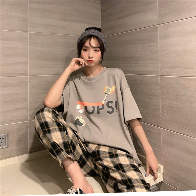 0943#Gambar Sebenar Kotak-Kotak Pendek Lengan Pendek Set Versi Korea Manis Pakaian Rumah Teman Wanita Longgar Lapang Musim Panas Baru | Shopee Malaysia