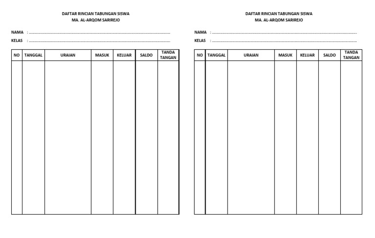 Contoh Format Tabungan Sekolah SD Kelas 1 2 3 4 5 6 - Berkas Edukasi