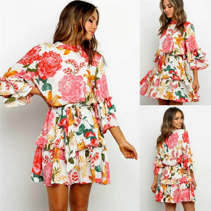 2020 Tren Fashion Wanita Gambar Bunga Ruffle Bungkus Longgar Gaun Pesta Wanita Perban Lengan Panjang Mini Gaun Musim Panas Pantai Vestitos|Gaun| - AliExpress