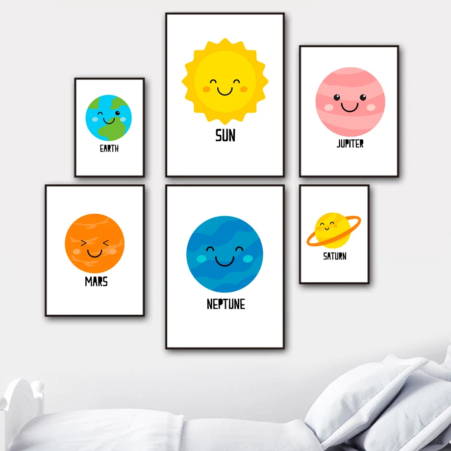 Lucu Kartun Matahari Bumi Jupiter Mars Saturnus Dinding Seni Lukisan Kanvas Nordic Poster dan Cetakan Dinding Gambar Bayi Kamar Anak dekorasi|Painting & Calligraphy| - AliExpress
