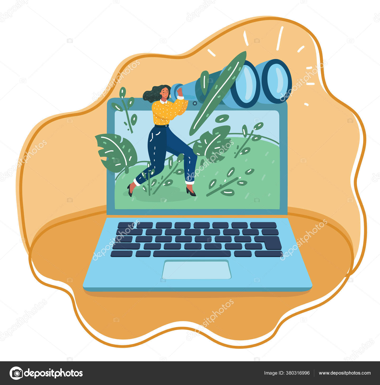 Wanita melihat ke teropong dalam laptop. — Stok Vektor © cosmaa #380316996