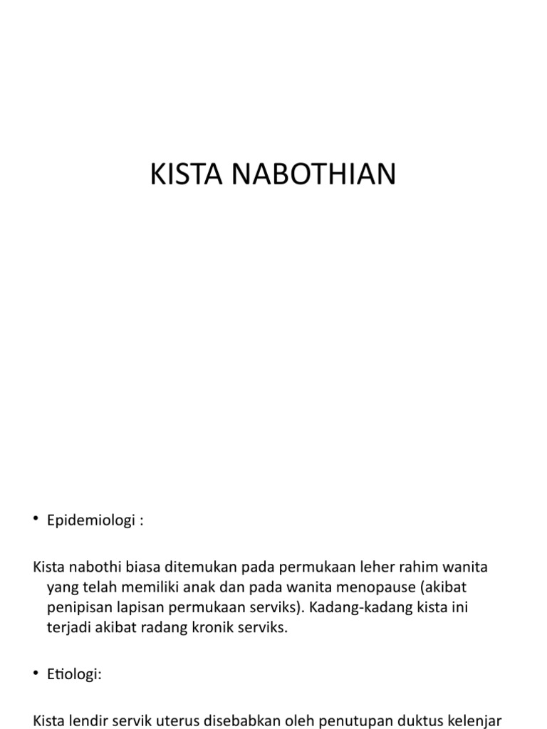 BAB I PENDAHULUAN Kista Nabothi disebut juga folikel nabothi, kista inklusi epitel, atau kista retensi musinosa. Kista Nabothi t