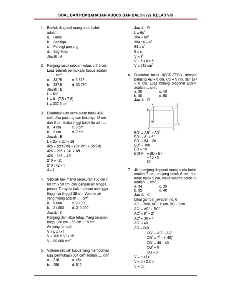 soal ulangan harian dan pembahasan materi kubus dan balok.