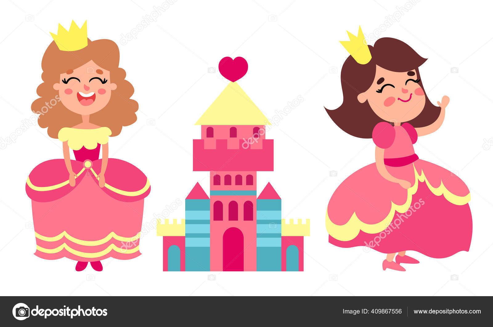 Princess Girl with Golden Crown and Fairy Castle Vector Set — Stok Vektor © Happypictures #409867556