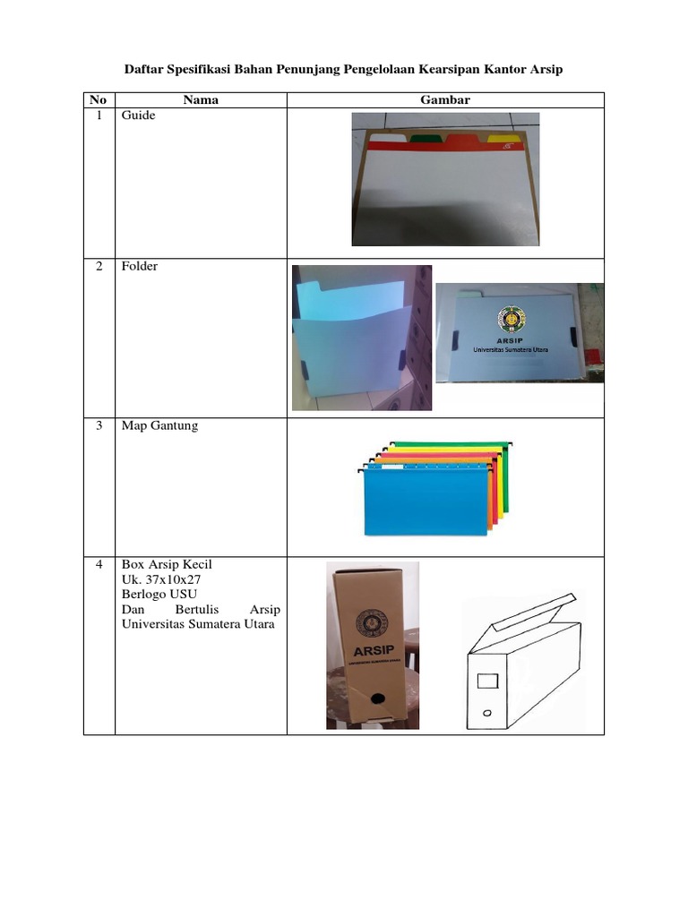 1 Guide: Daftar Spesifikasi Bahan Penunjang Pengelolaan Kearsipan Kantor Arsip No Nama Gambar