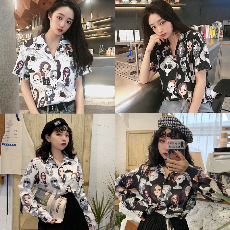 kaos kemeja Kemeja Wanita Model Kerah Lapel dengan Potongan Longgar dan Gambar Kartun Bergaya Korea | Shopee Indonesia
