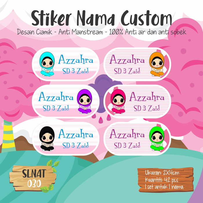 SLNAT-040 sticker label nama anak sekolah kartun cute waterproof tahan air lucu muslimah hijab | Shopee Indonesia