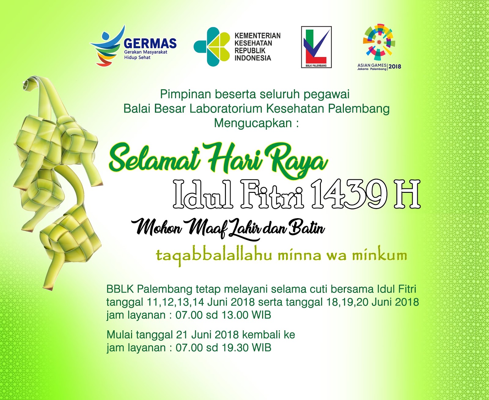 Ucapan Selamat Hari Raya Idul Fitri 1439H dan info pelayanan ~ BBLK Palembang