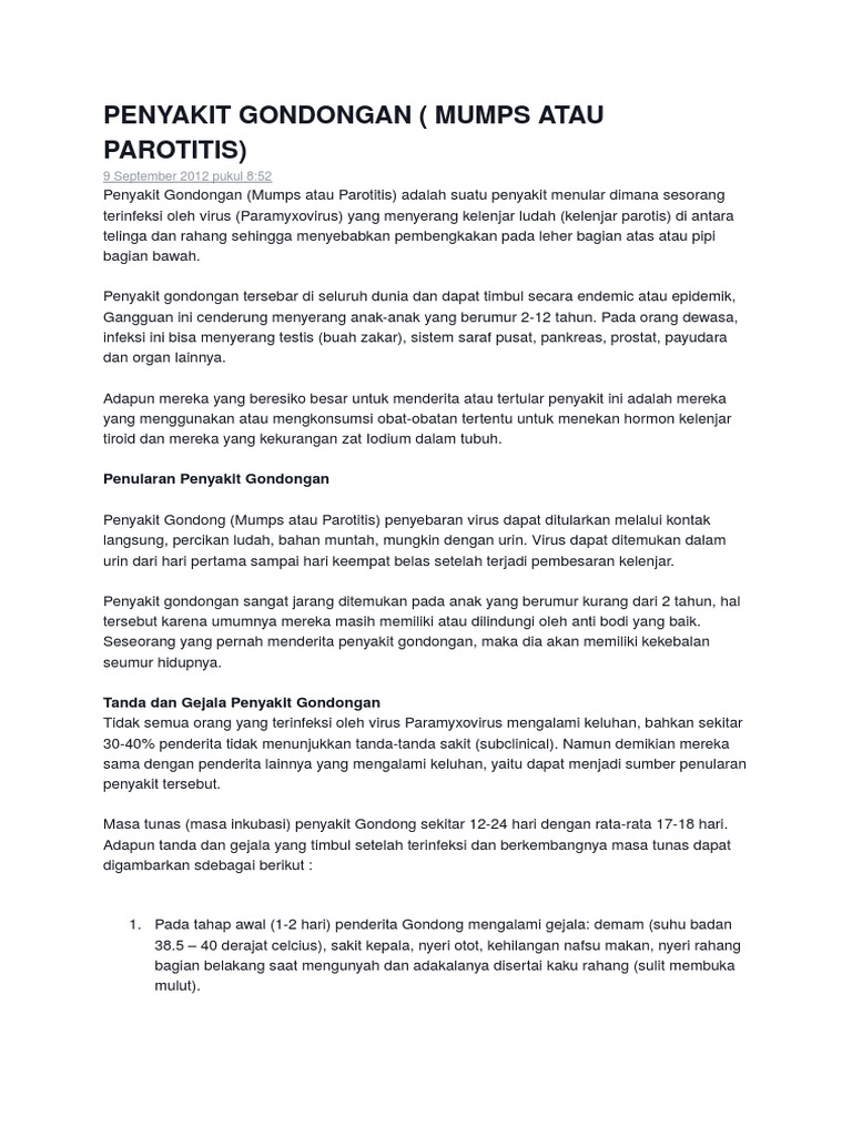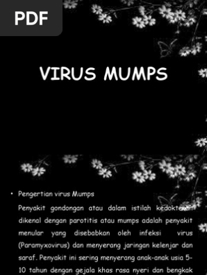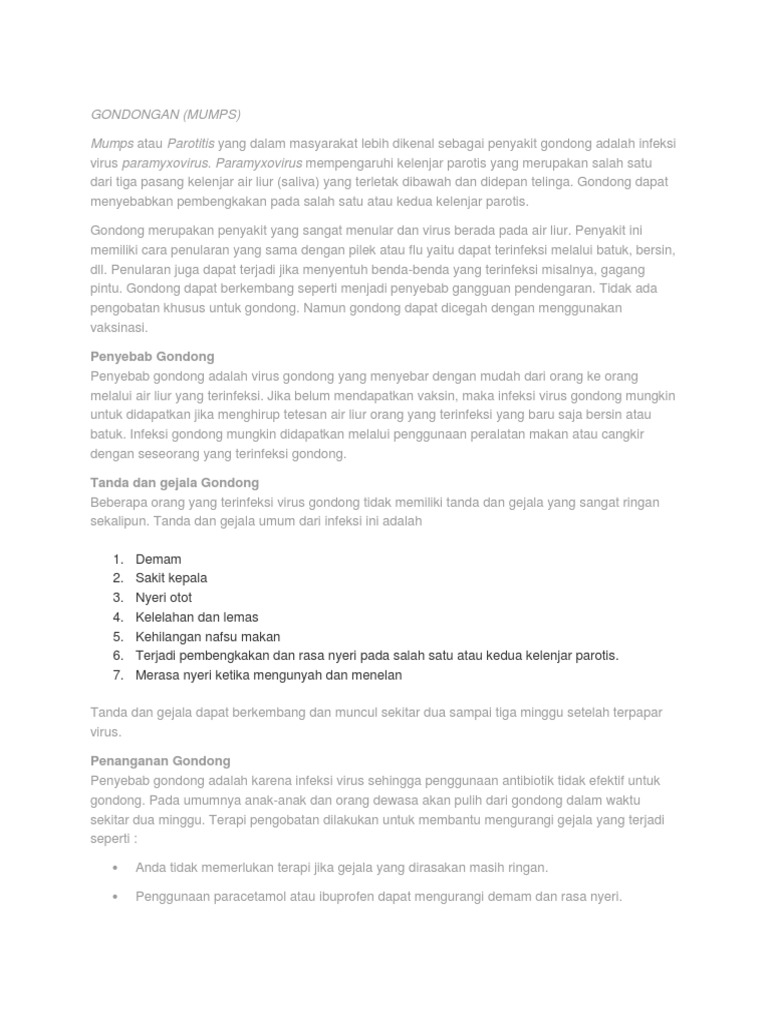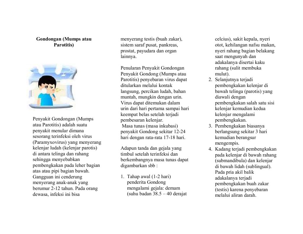 Gondongan (Mumps) Mumps atau Parotitis yang dalam masyarakat lebih dikenal sebagai penyakit gondong adalah infeksi