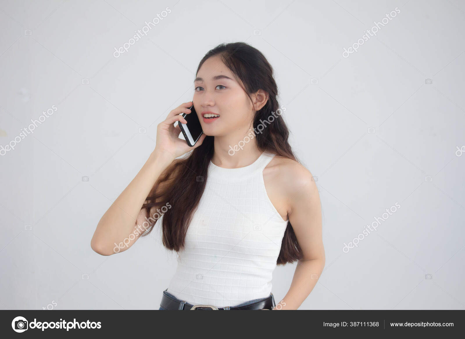 Portrait Thai China Gadis Cantik Baju Putih Blue Jeans Calling — Stok Foto © pb20th@yahoo.com #387111368