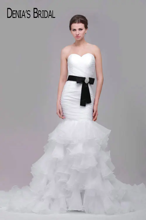 Gambar aktual Sayang Lengan Mermaid Wedding Dresses dengan Hitam Sash Lipatannya Ruffles Rok Chapel Kereta Bridal Gowns-in Wedding Dresses from Pernikahan & Acara on AliExpress