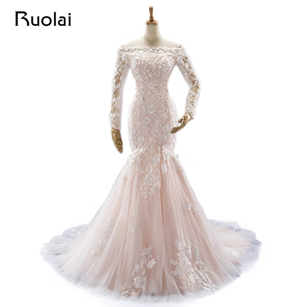 Nyata Gambar Blush Wedding Dresses Lengan Panjang Off Bahu Beaded Lace Mermaid Gaun Pengantin Bridal Robe de Mariage FW64|robe de mariage|wedding gown bridalblush wedding dress - AliExpress