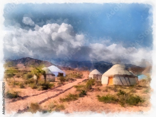 Hand drawing watercolor art on canvas. Artistic big print. Original modern painting. Acrylic brush background. Beautiful view of the steppe and mountains. Traditional huts of local mountain dwellers. - Buy this stock
