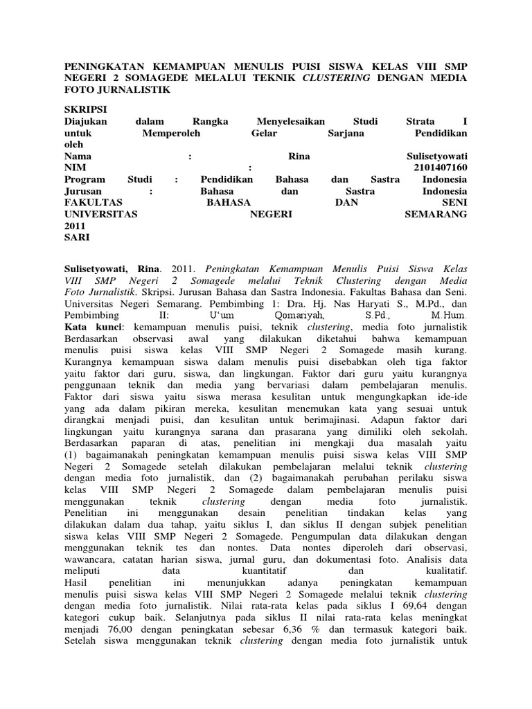 Peningkatan Kemampuan Menulis Puisi Siswa Kelas Viii Smp Negeri 2 Somagede Melalui Teknik Clustering Dengan Media Foto Jurnalistik