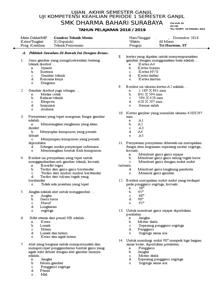 X TKR Soal-Gambar-Teknik.docx - PENILAIAN AKHIR SEMSTER SMK NUSANTARA 89 TEKNIK KENDARAAN RINGAN MATA PELAJARAN GAMBAR TEKNIK KELAS X SEMESTER 1 Nama | Course Hero