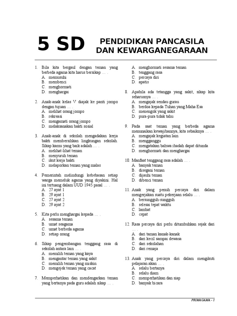 DOC) Contoh Soal Mata Pelajaran PKn SD Kelas 5 | Afifah Sweet’s - Academia.edu