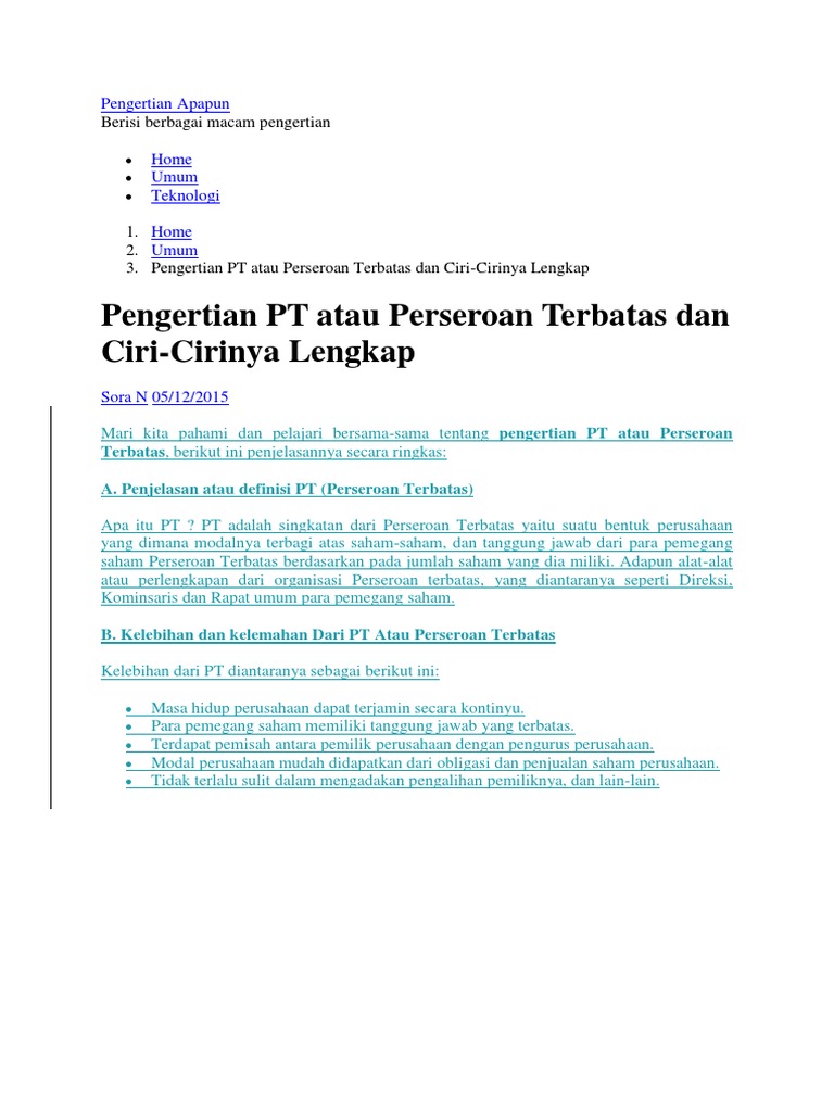 Pengertian PT atau Perseroan Terbatas dan Ciri-Cirinya Lengkap - Pengertian Apapun