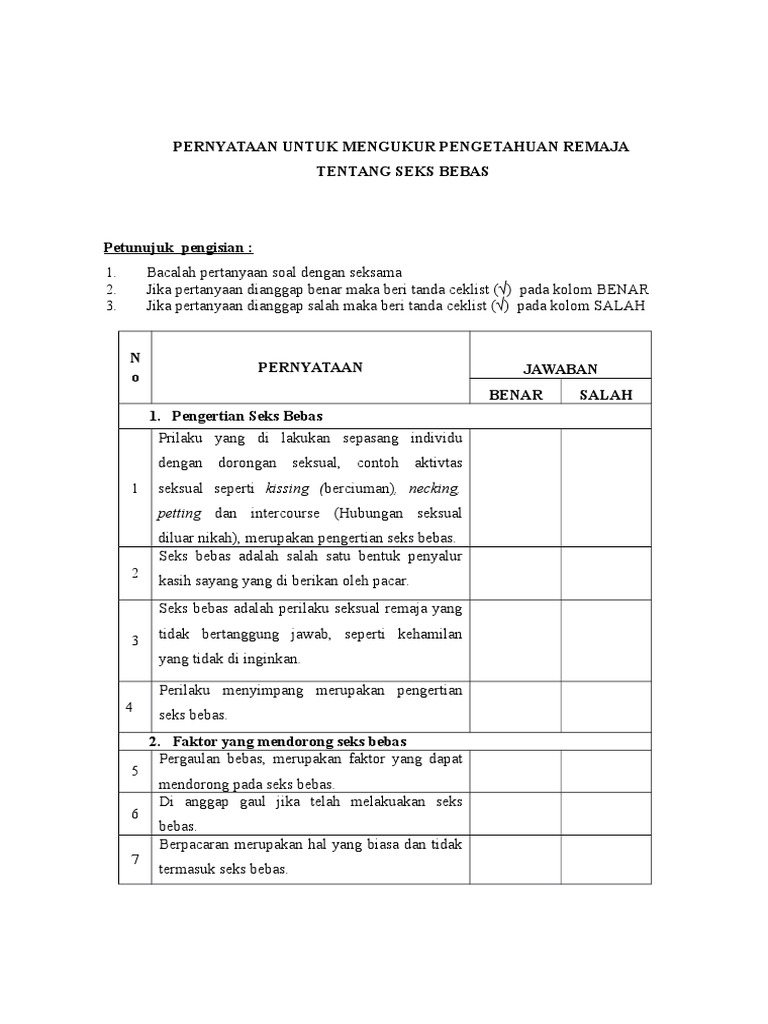 contoh kuesioner pengtahuan seks bebas dan sikap terhadap seks bebas