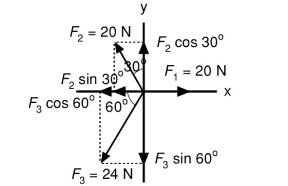 Tiga buah vektor gaya masing-masin besarnya F1 = 10 N, F2 = 30 N, dan F3 = 20 N. Arah ketiga vektor - Mas Dayat
