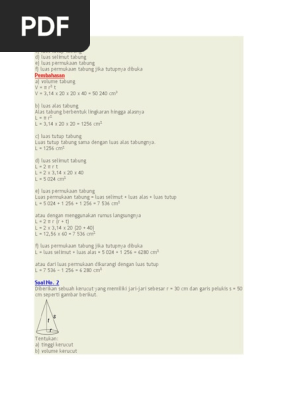 Materi Bangun Ruang Sisi Lengkung SMP Kelas .Materi Matematika SMP Kelas 9 Bangun Ruang Sisi Lengkung … Pembahasan a) volume tabung V = r2 t V = 3,14 x 20 x 20 x 40 = 50 240 cm3