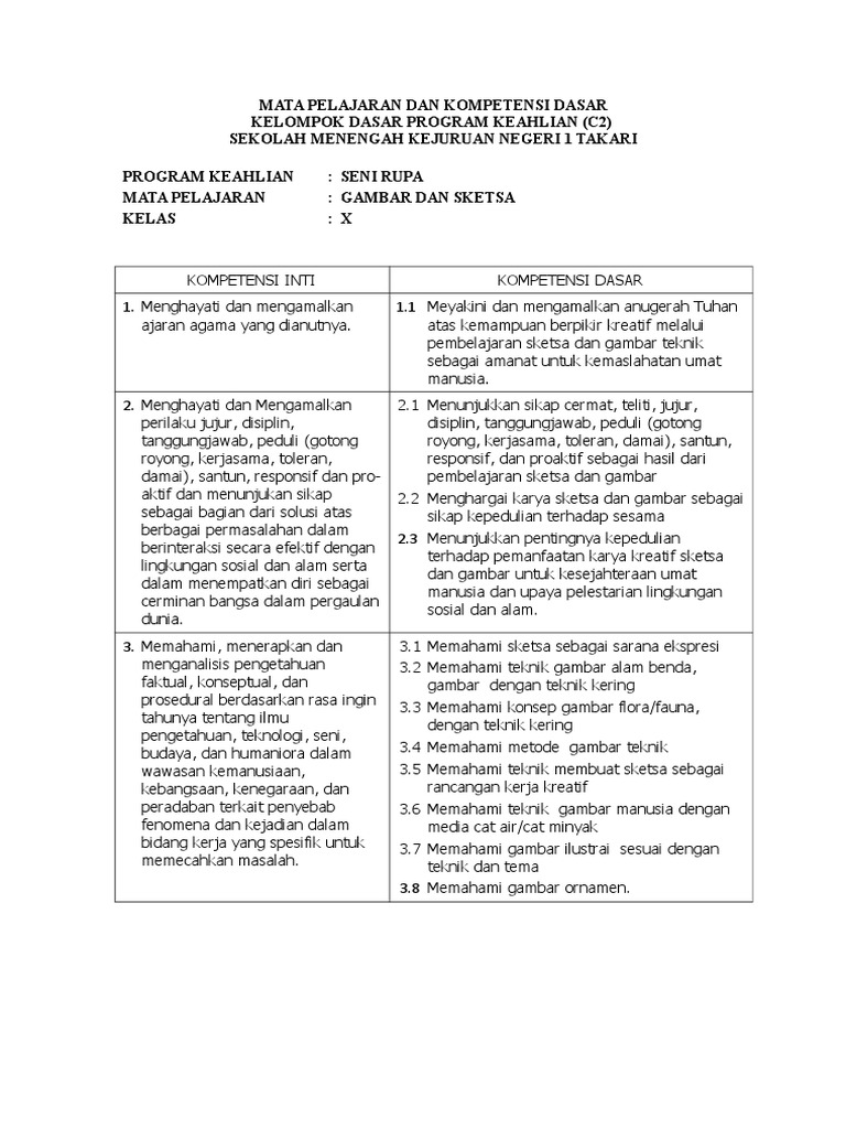 Mata Pelajaran Dan Kompetensi Dasar Kelompok Dasar Program Keahlian (C2) Sekolah Menengah Kejuruan Negeri 1 Takari Program Keahlian: Seni Rupa Mata Pelajaran: Gambar Dan Sketsa Kelas: X