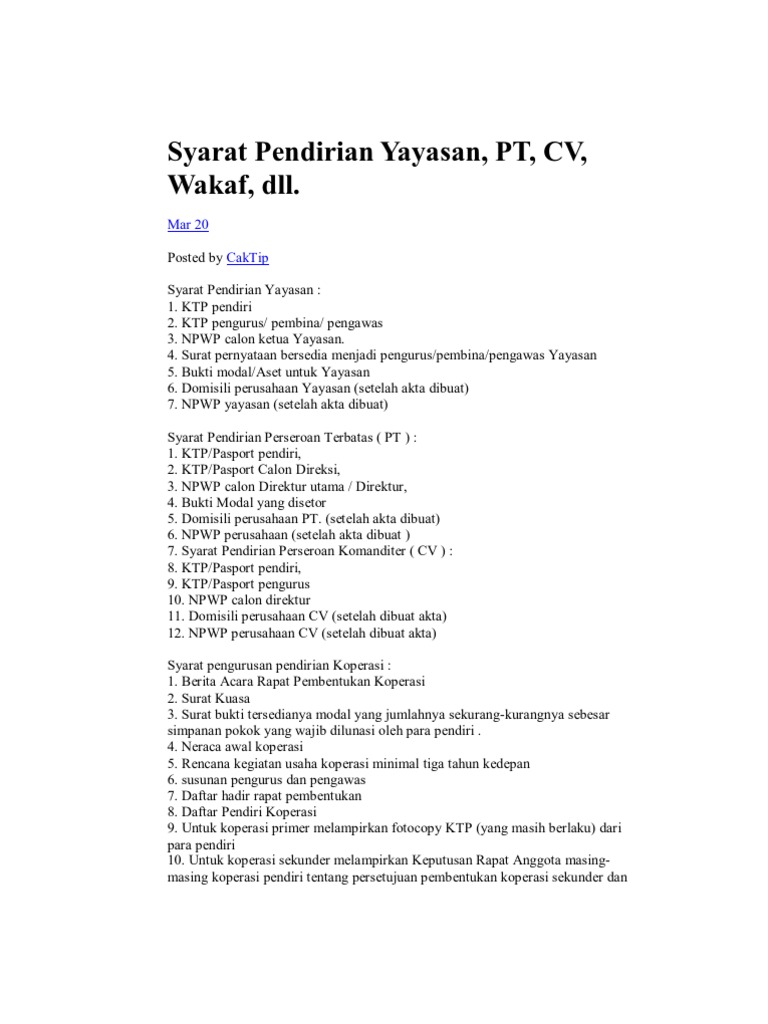Syarat Pendirian Yayasan, PT, CV, Wakaf, dll.