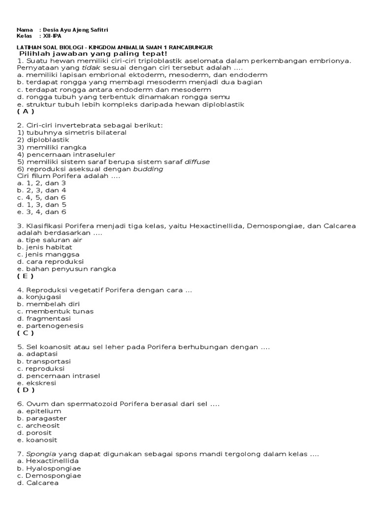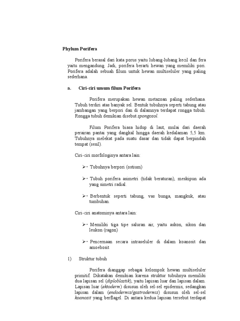 biologi SET 21 ANIMALIA 1 DAN LATIHAN SOAL SBMPTN ADVANCE AND TOP LEVEL A. FILUM PORIFERA a. Ciri Ciri Porifera - PDF Free Download